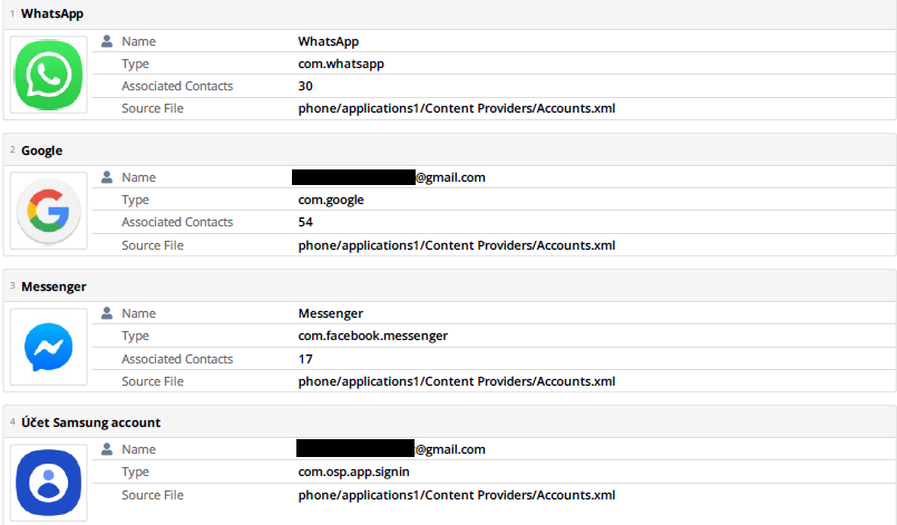 This section shows all accounts associated with the device under investigation, such as Facebook, Google, and more: