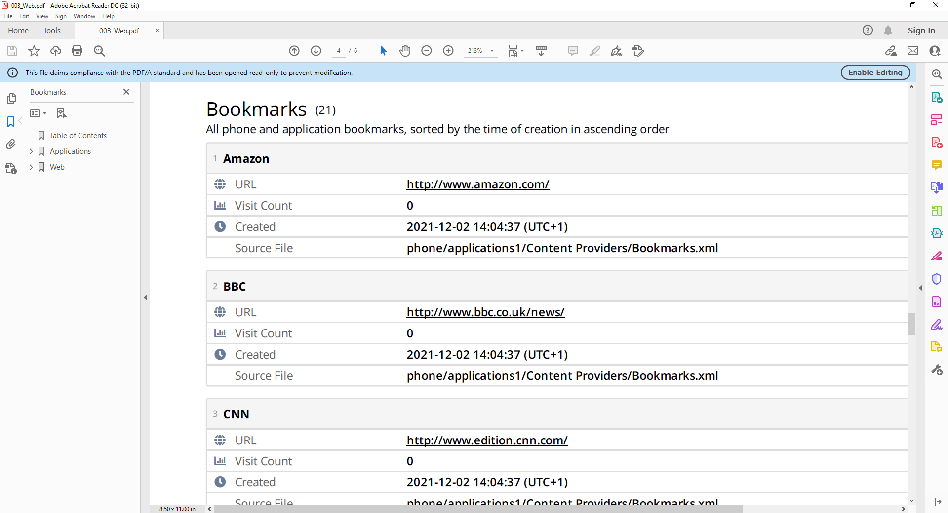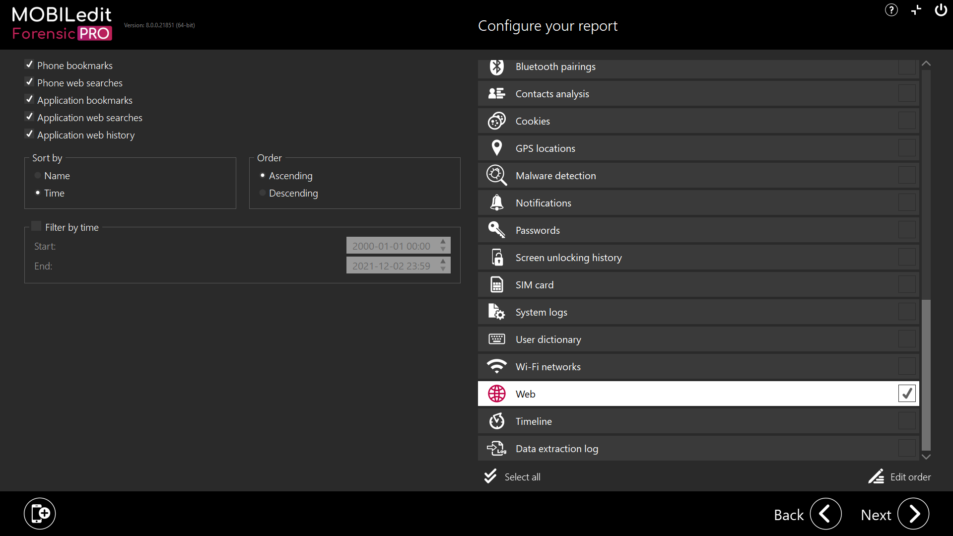 MOBILedit Forensic can extract and analyze web searches, bookmarks, and history made by any app in the investigated device.