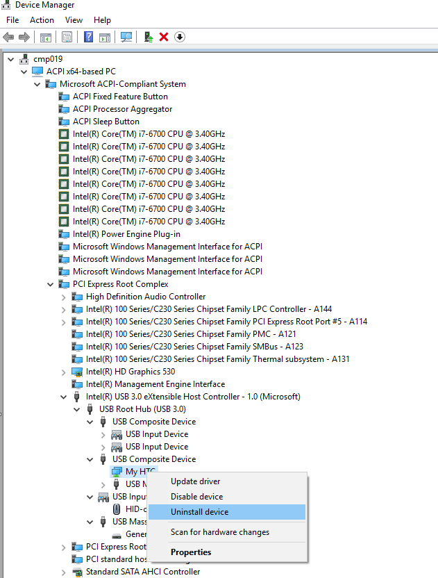 4. Install the Universal ADB driver and then reconnect your HTC device. You can check if you did everything correctly by opening the device manager > "View" > "Devices by connection". You should see an HTC Android Phone USB Device as your installed driver for your HTC device.