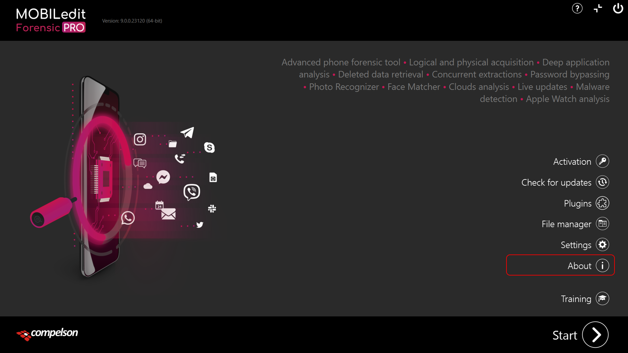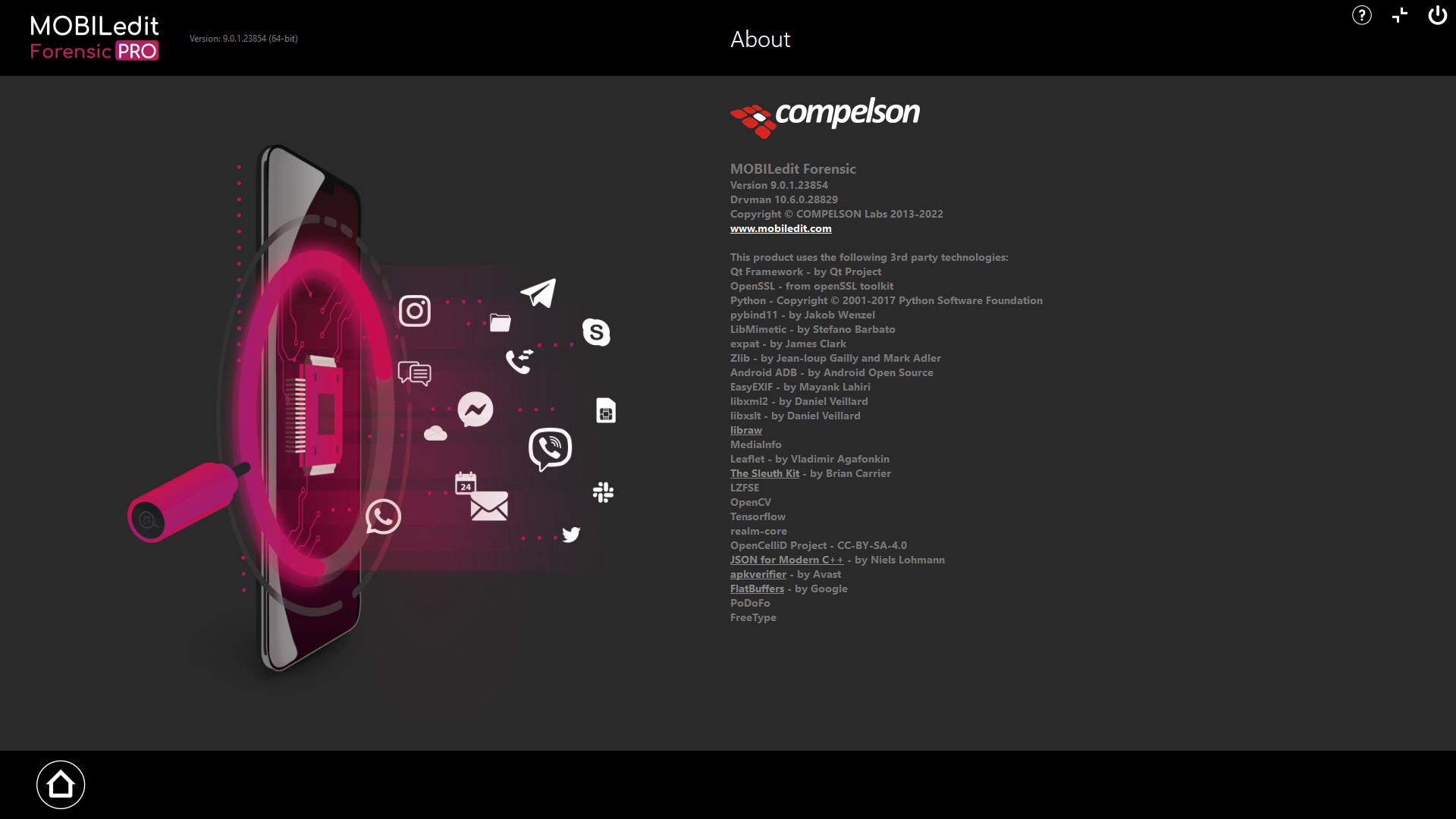 In this view we list details about MOBILedit Forensic; the SW version number, driver manager version number, a link to our website and also a comprehensive list of the programming languages and third-party plugins and sources used to run the SW.