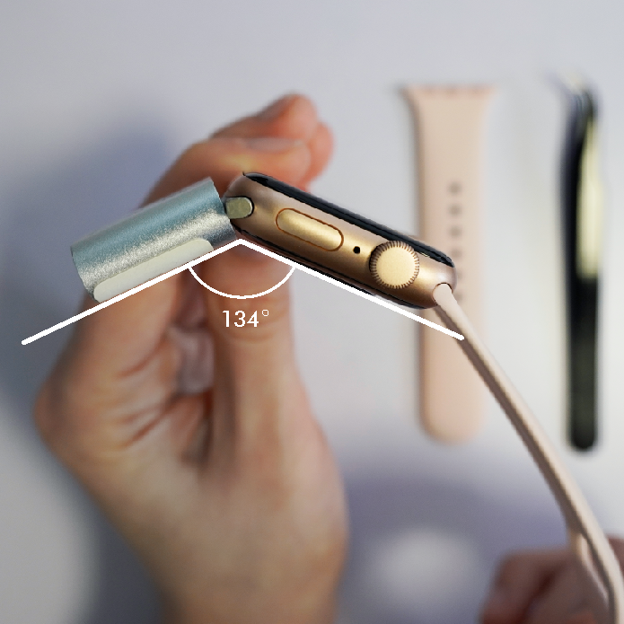 Then, very carefully, connect the iBUS adapter to the watch diagnostic port by inserting it through the adapter. The connected adapter should sit at an angle of approximately 134 degrees to the watch.