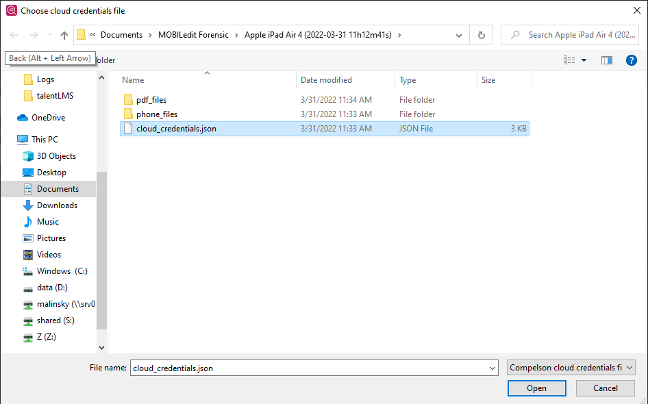 3. Select the cloud credentials file that has been previously extracted from the device. This is stored in the file “cloud_credentials.json”: