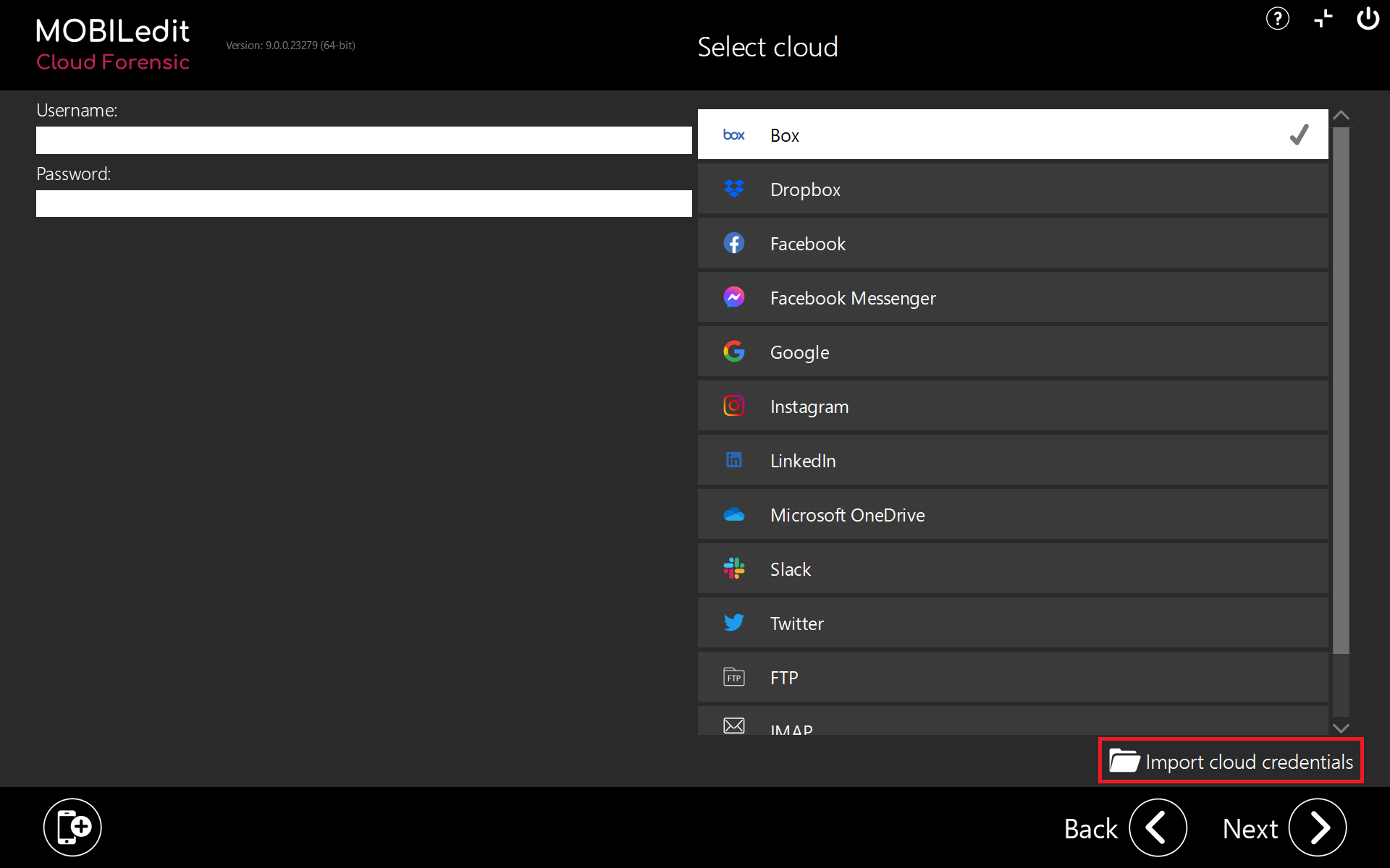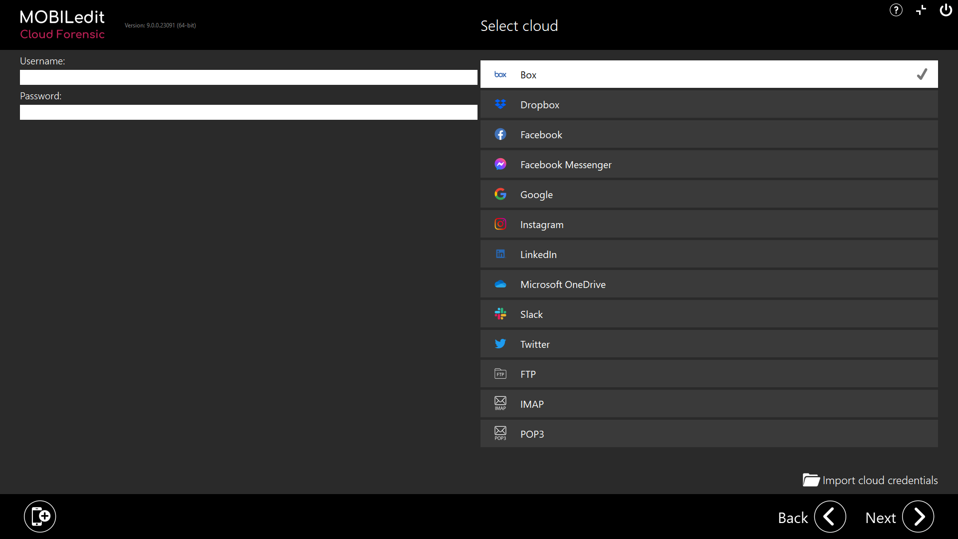 MOBILedit Cloud Forensic standalone software product is for investigating cloud storage and cloud services without the need to examine mobile devices. Access to clouds using this method requires a password and a username or a token imported from another source.