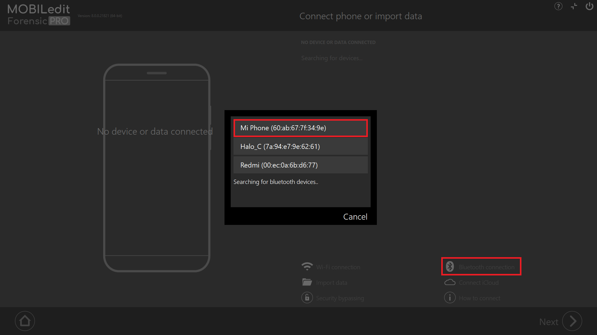 If you encounter any issues connecting your mobile device within MOBILedit Forensic, please close MOBILedit Forensic and establish the Bluetooth connection. Once connected, reopen MOBILedit Forensic.