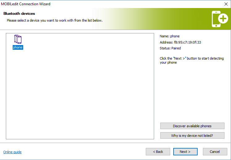 When pairing is done successfully you will see the phone in connected Bluetooth devices in your PC´s BT settings. When this is done you can view the connected phone in MOBILedit Forensic (or any other software of ours). Simply go to the Connection Wizard and select Android - BT connection. Your phone will be found by our Wizard - click on it and a connection should be established.