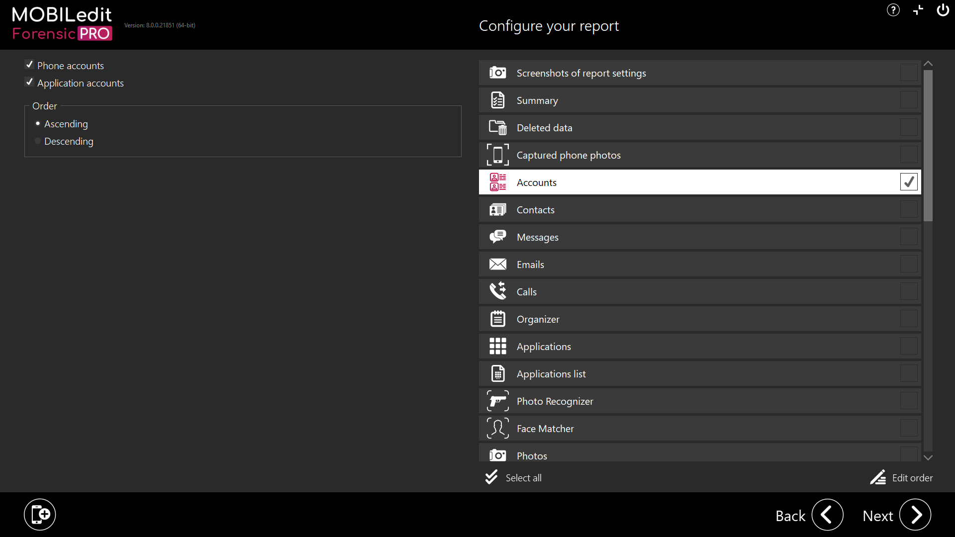 This section shows all accounts associated with the device under investigation, such as Facebook, Google, and more: