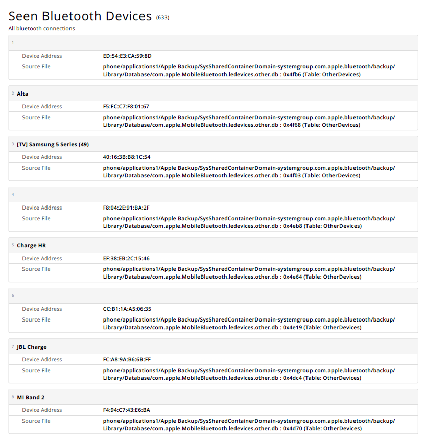 MOBILedit Forensic is able to extract a list of all devices connected to your phone via Bluetooth or appeared within its reach.
