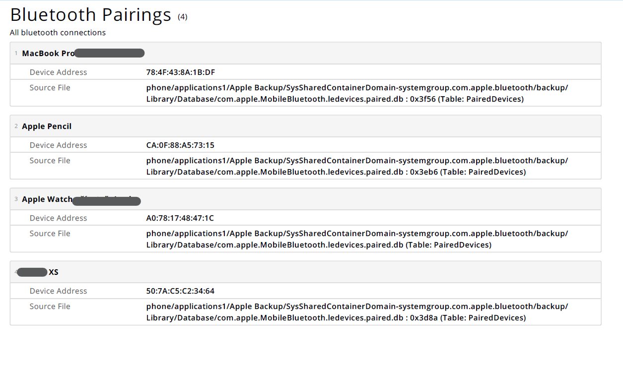 Example of Bluetooth pairings report: