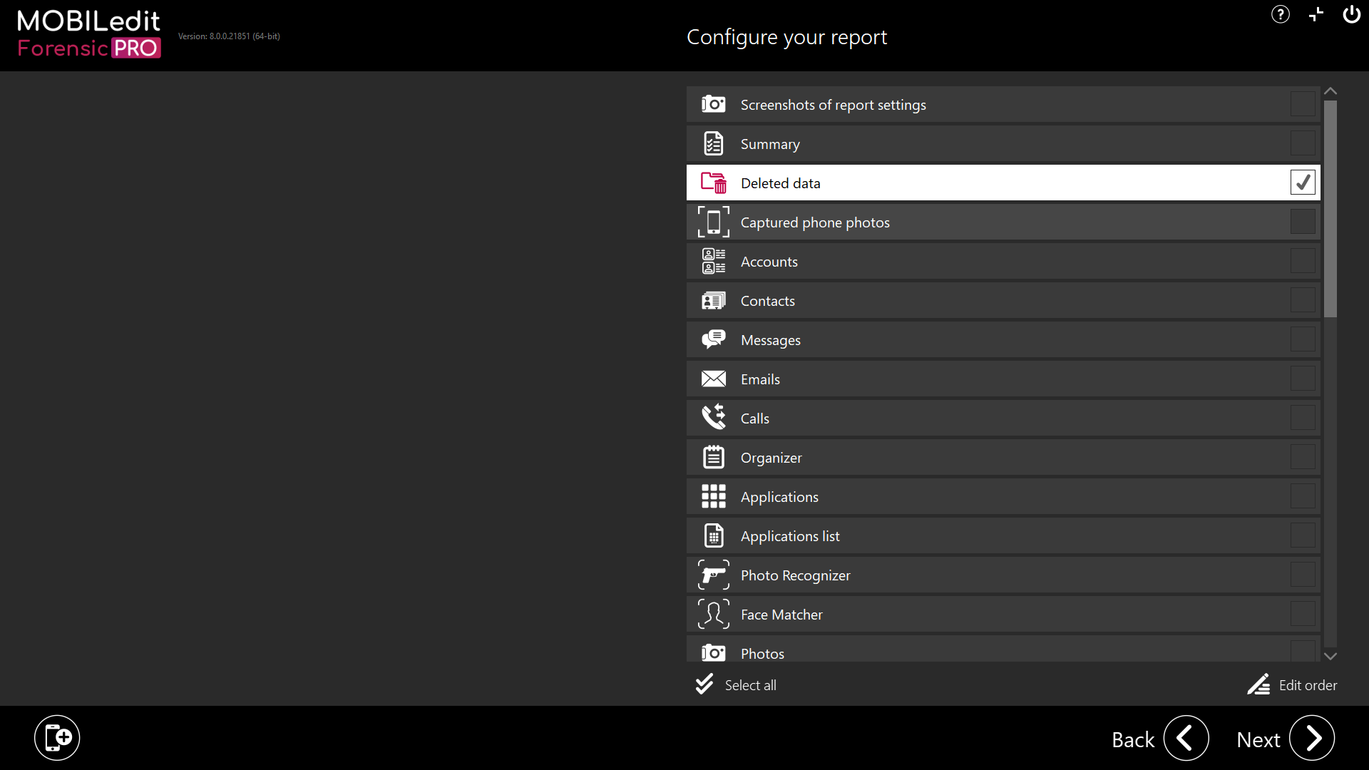 MOBILedit Forensic is able to recover deleted data. One method is recovering data from SQLite databases, and another method is recovering the files and folders using Security bypassing & backups.