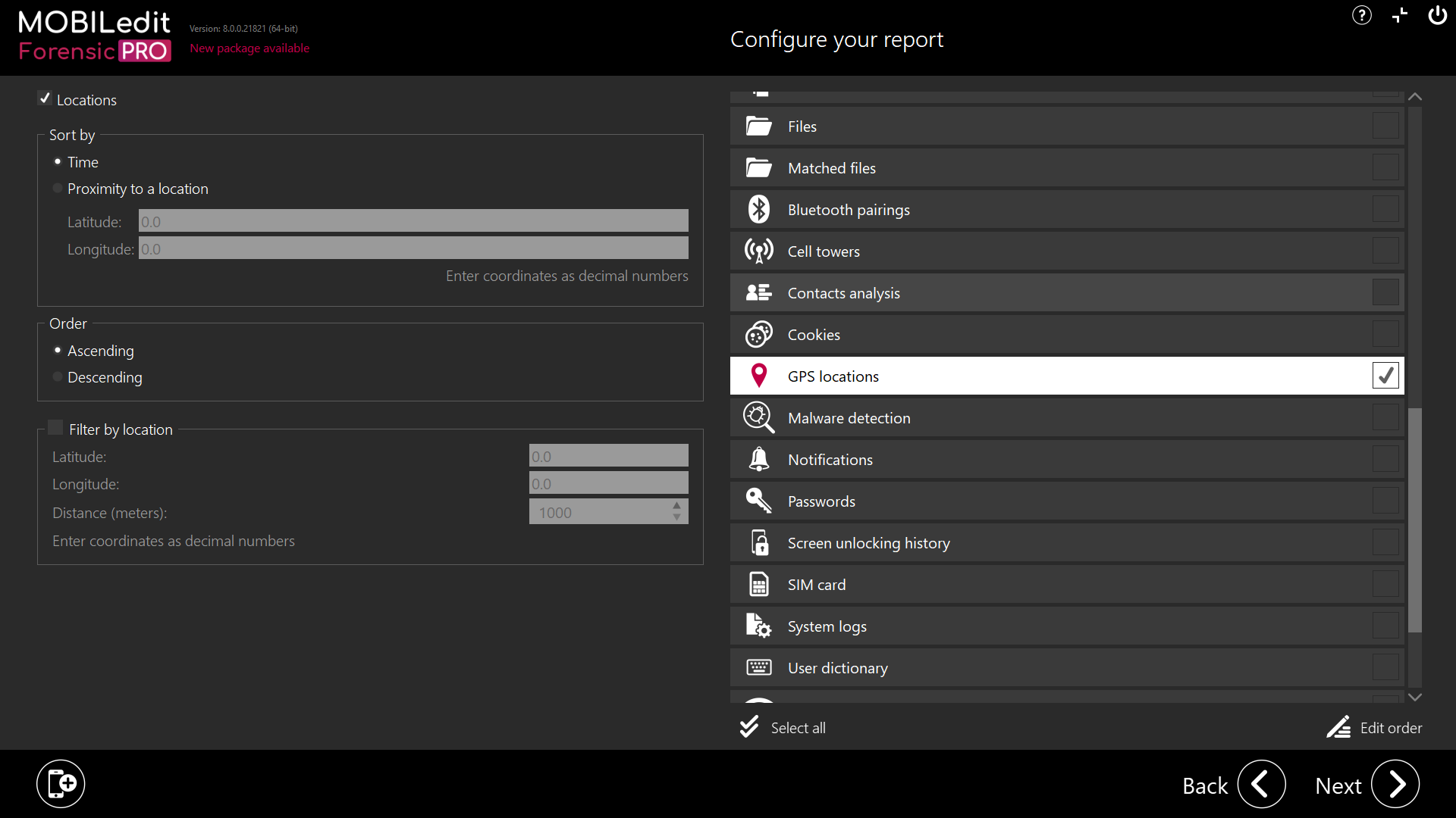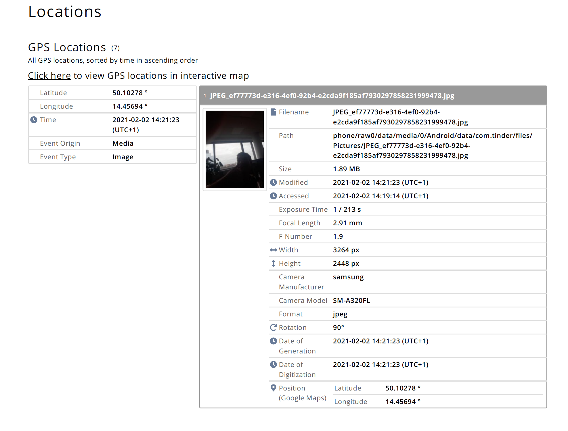 Extracted GPS coordinates can be reviewed in an interactive map within the software, with filtering options by point type and time to support deeper forensic analysis. They are also shown in the Timeline if it is selected within Logical > Specific selection > Timeline