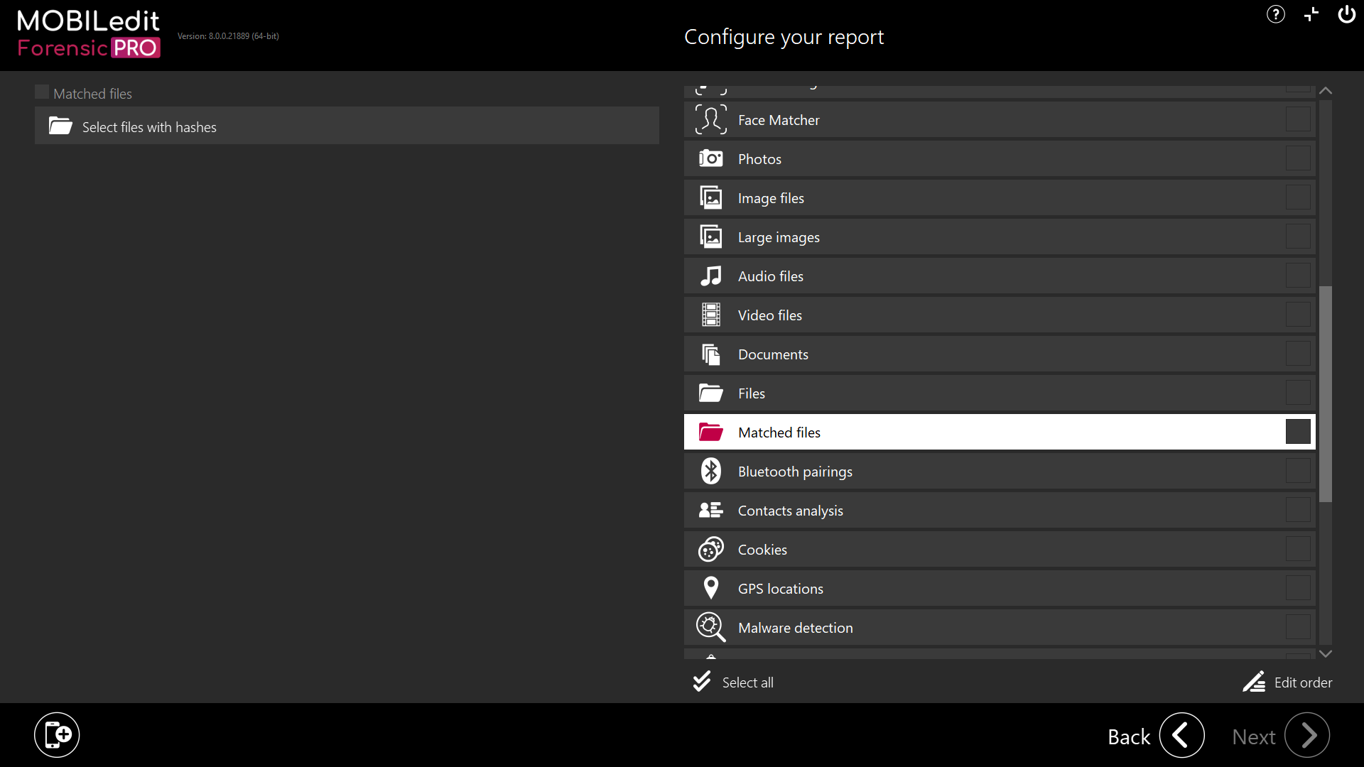 Matched Files enable you to highlight files based on a user-supplied hash list. The imported hash list must be in a UTF-8 format, with each hexadecimal hash on a separate line. The suffix of the hash list must be md5, sha1, sha256 or sha512. Using Matched Files will generate a section in the report with files highlighted based on the supplied hash list.