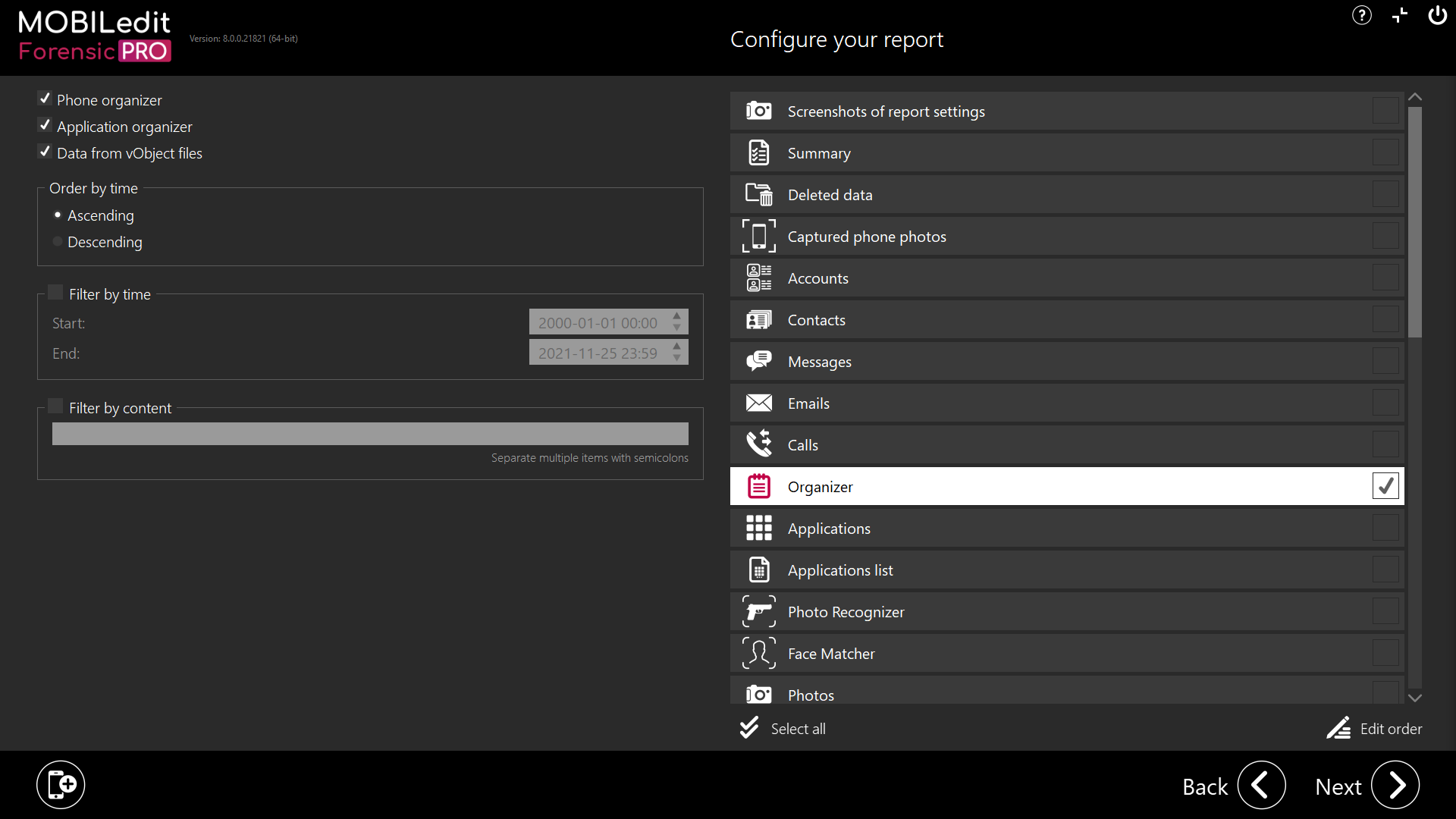 Merges also organizer items retrieved from the application data. Organizer entries can be sorted by time in ascending or descending order.