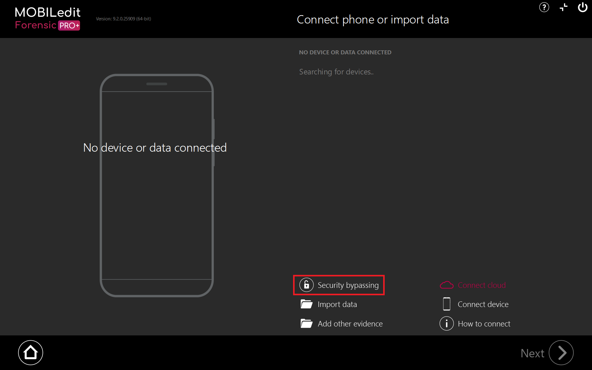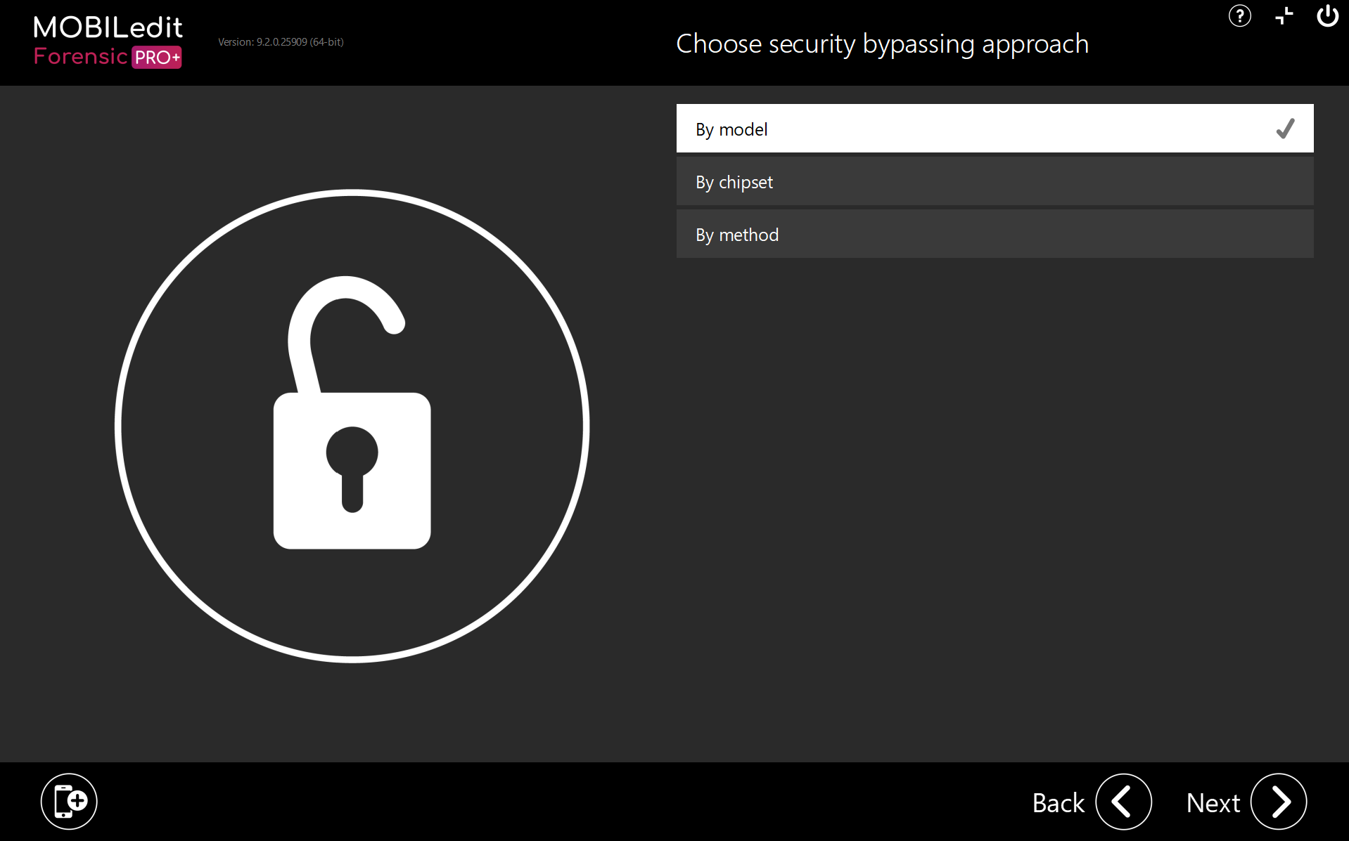 In the MOBILedit Forensic interface, locate and click on the "Security Bypassing" option and select the “By Model" option.