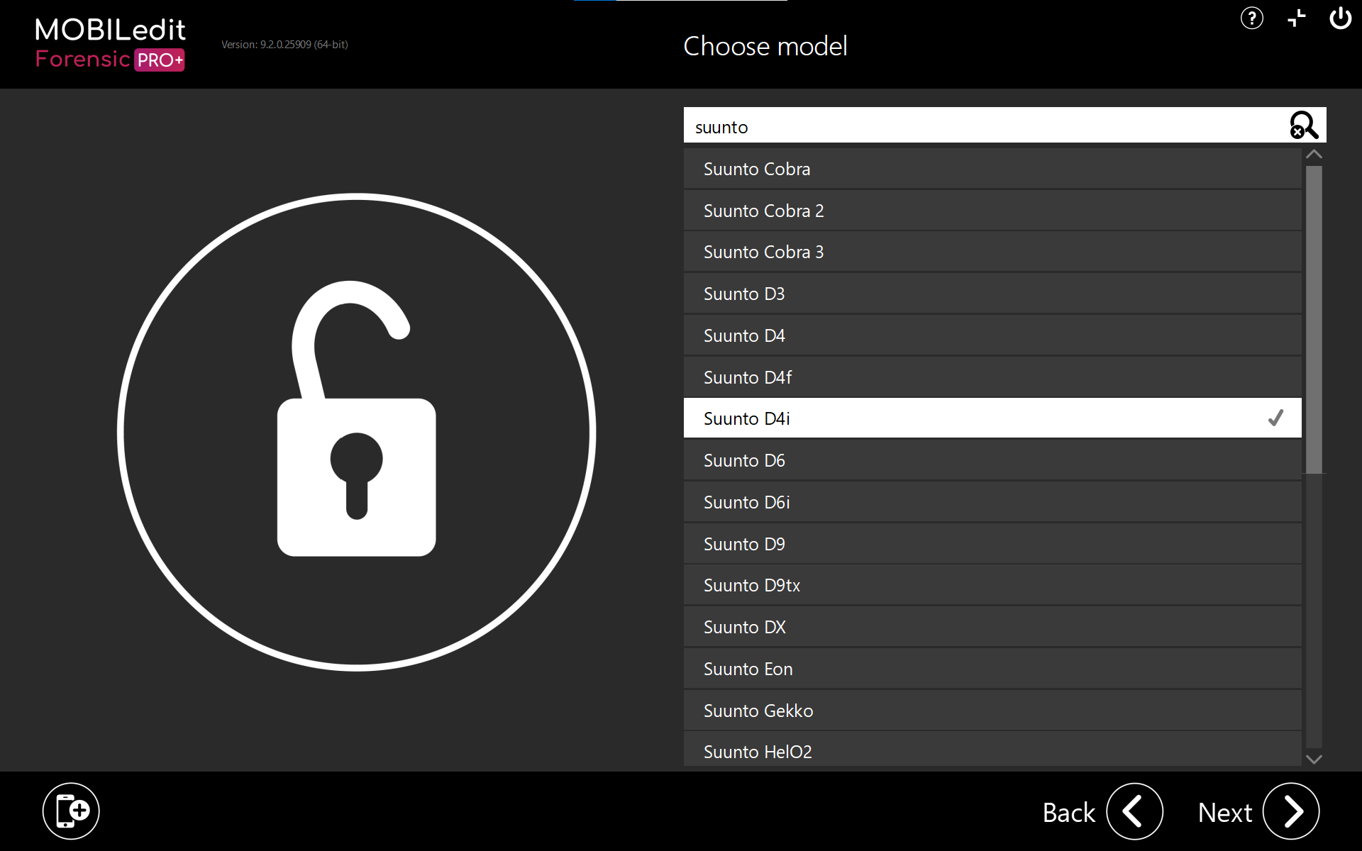 Search for your dive computer model, use the search function, and find the specific model you want to connect to MOBILedit Forensic.