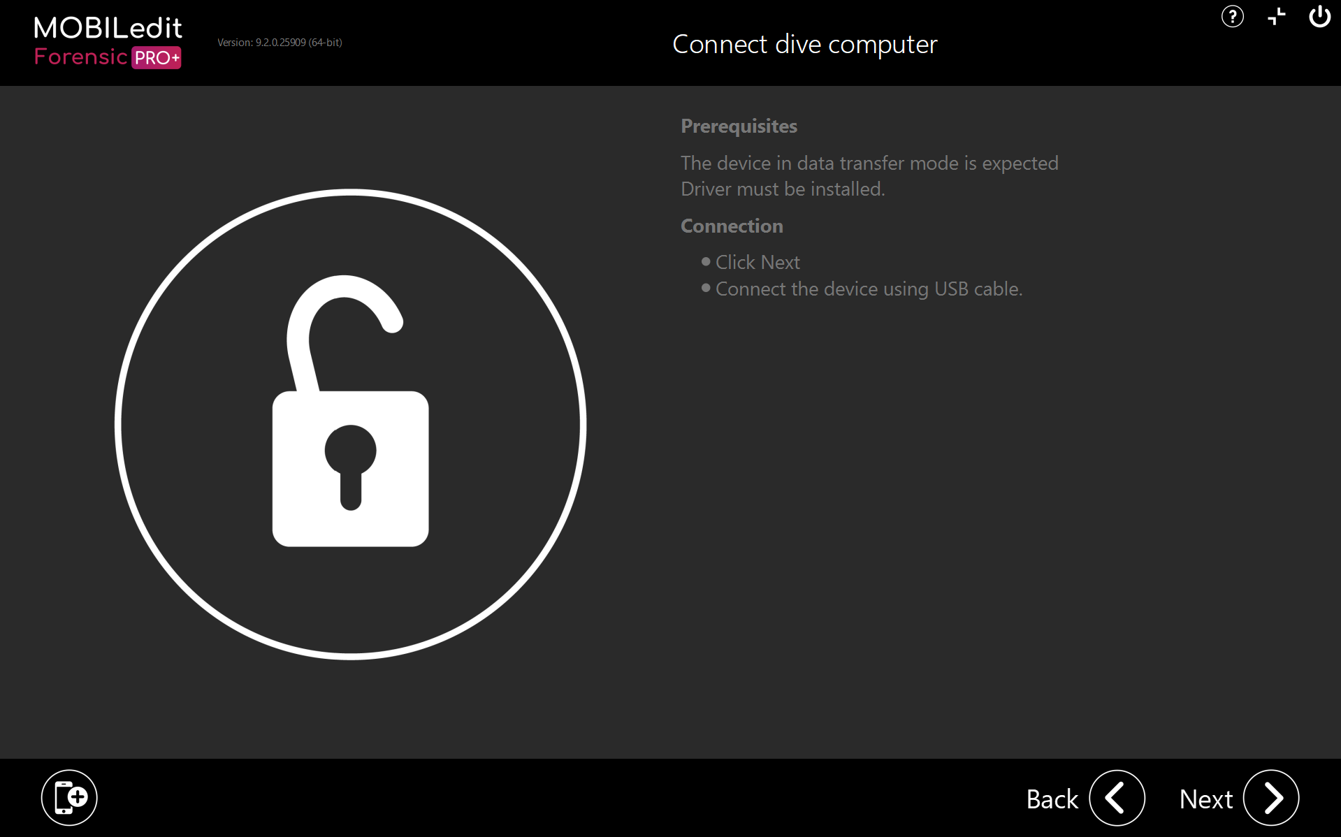 MOBILedit Forensic will provide on-screen instructions to guide you through the connection process. Follow these instructions carefully to ensure a successful connection between your dive computer and the PC.