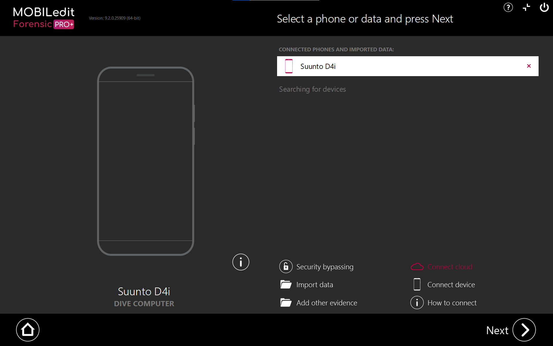 Connected dive computer to the PC, MOBILedit Forensic will automatically detect the device.