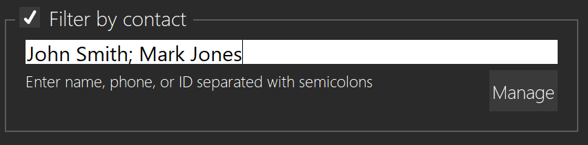 All filters using text are not case-sensitive (both upper and lower case letters are recognized). Text filters ignore diacritics (i.e. accents, glyphs, symbols and other marks added to letters in various languages), and ignore all non-alphanumeric characters (! @ # $ % & etc.). Multiple search terms can be specified - such as names, phone numbers or specific keywords and phrases - but should be separated by semicolons. At least one of the items must have a match in order to be displayed in the report. If the search terms contain spaces, each word is searched for separately, but all words must be present in a single text value simultaneously.