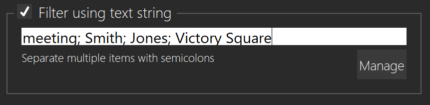 For both contact and text string filters, you can click the manage button which will let you enter multiple text strings more easily either by typing them directly in the multi-line text field or by inserting a text (.txt) document.