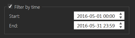 Most sections can be filtered by time. When this filter is enabled, you may enter a time range, and only items that contain a timestamp in this range will be listed in the report. This may be for example the timestamp of a message, the time of a call, a calendar event, the creation or modification time of a file, photo or contact, and others. The time entered is in the time zone of your computer. Unlike other filter types, if you set the Time filter globally, you cannot use a different one locally.