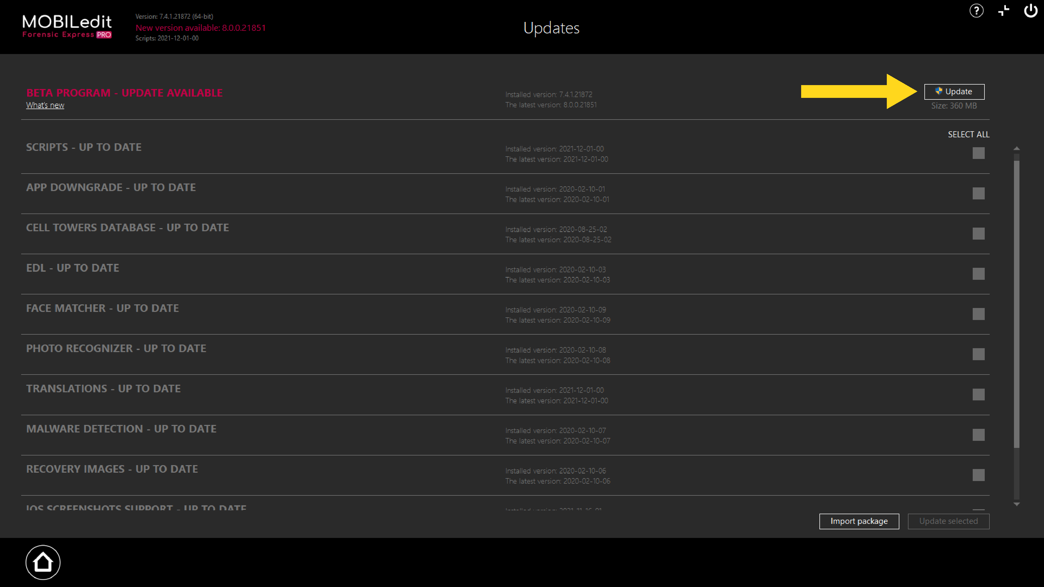 To update to the BETA version of MOBILedit Forensic, select "Update" from the home screen of the existing MOBILedit Forensic application.
