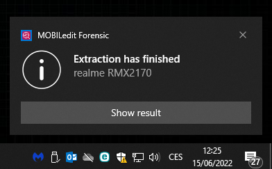 If MOBILedit Forensic is running in the background you will be informed of any events by Windows notifications if: