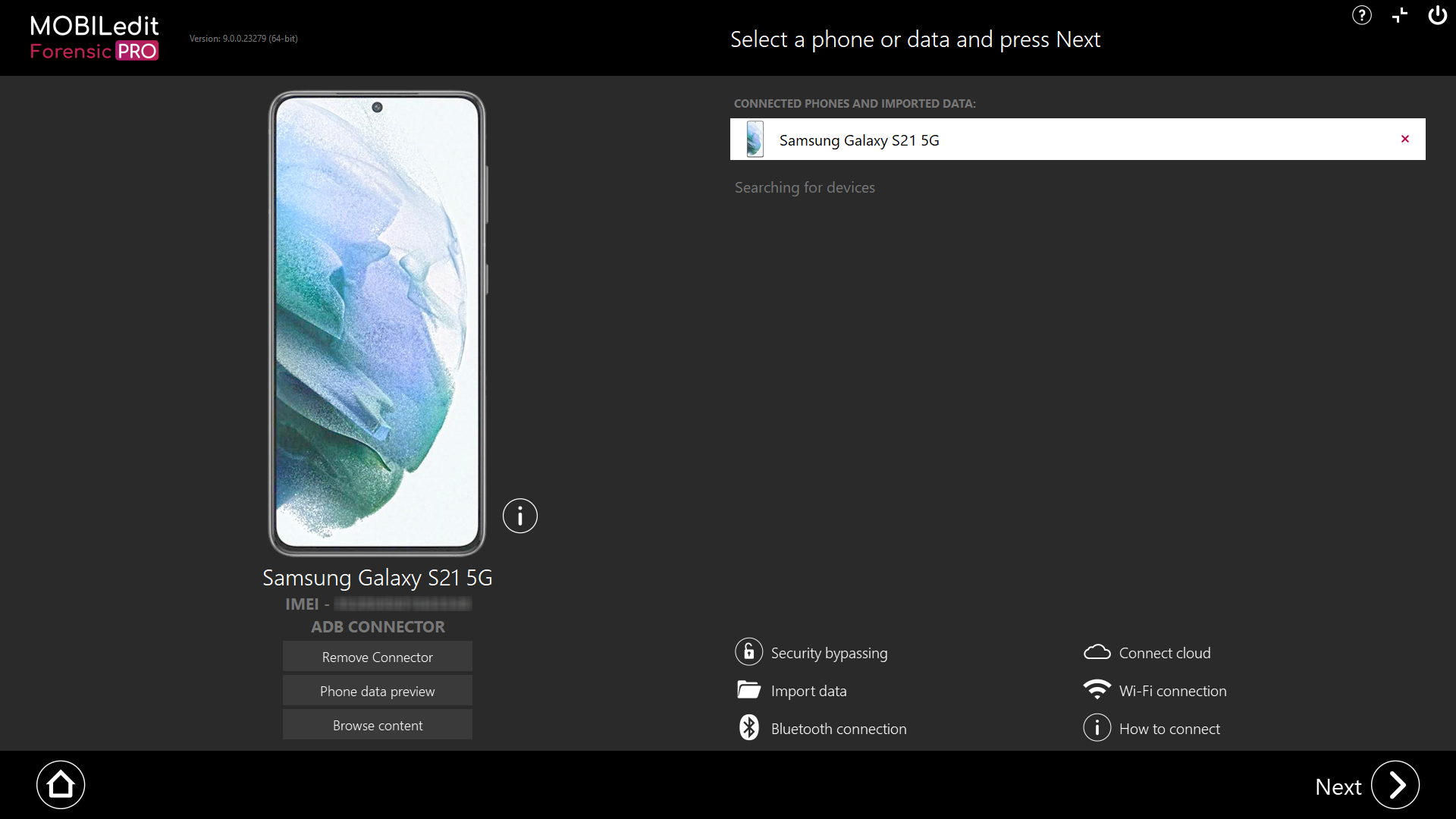Android devices have to be connected via the Forensic Connector app. In the screenshot below, you can see that the Forensic Connector app is installed and running as “ADB Connector” is shown under the connected device in MOBILedit Forensic. If the app is not installed, or not running correctly, only “ADB” will be shown.