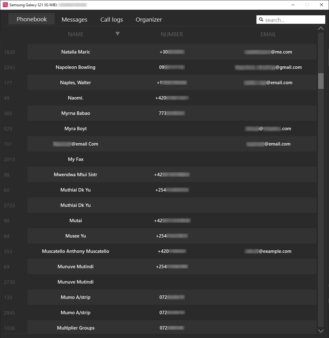 Obtainable data: Phonebook, Messages, Call Logs, and Organizer.