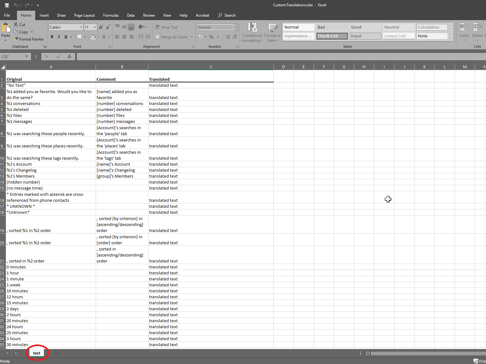 5. Open the CustomTranslations.xlsx and paste the copied template sheet.