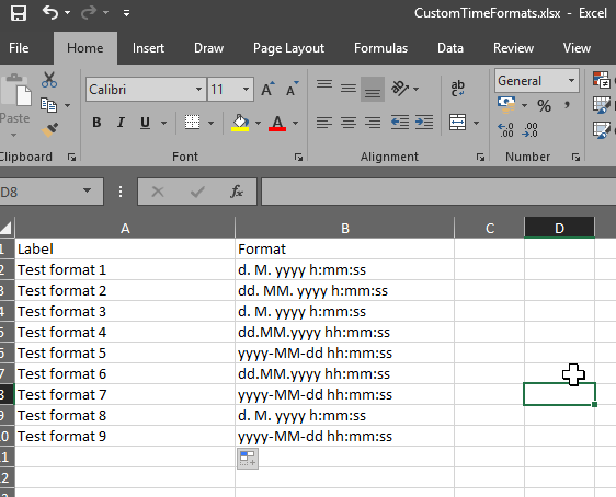 Type names In the "Label" column (e.g.: Test format 1), and in the "Format" column the format you want to use (e.g.: d. M. yyyy h:mm:ss).