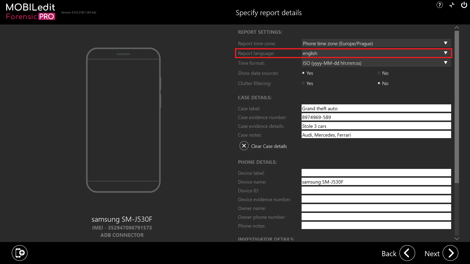 By default, the report language is set the same as the language of MOBILedit Forensic, but it can be changed to suit your needs in the specify report details section.