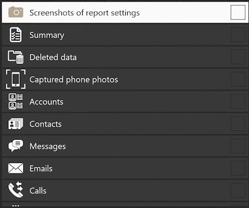Below is a list of categories that can be selected for extraction and analysis while using the specific selection. By selecting categories from this list you are essentially defining what will be extracted from the phone as well as what chapters you will see in the report.